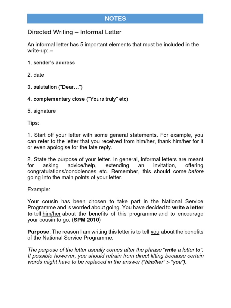Directed Writing Informal Letter Sample And Exercise