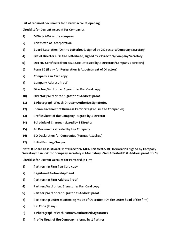 List Of Required Documents For Escrow Account Opening Government Information Business