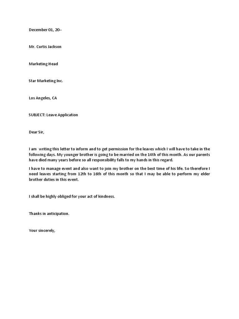 Sample Leave Application For Brother Marriage Ultimate Letter