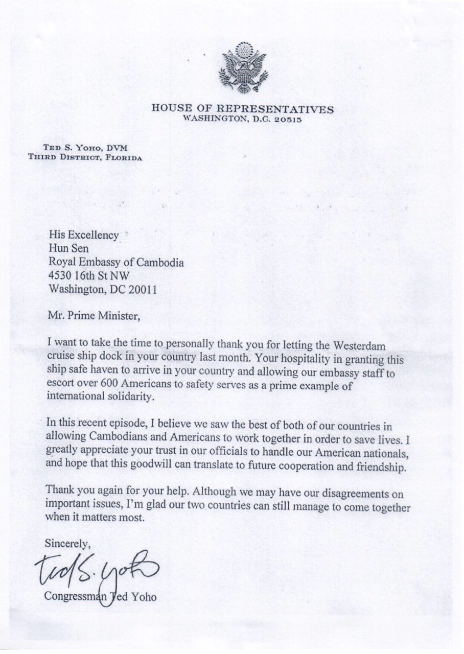 Letter Of Appreciation Of H E Mr Ted Yoho U S Congressman Represents North Central Florida S 3rd Congressional District Addressed To Samdech Akka Moha Sena Padei Techo Hun Sen Prime Minister Of The Kingdom