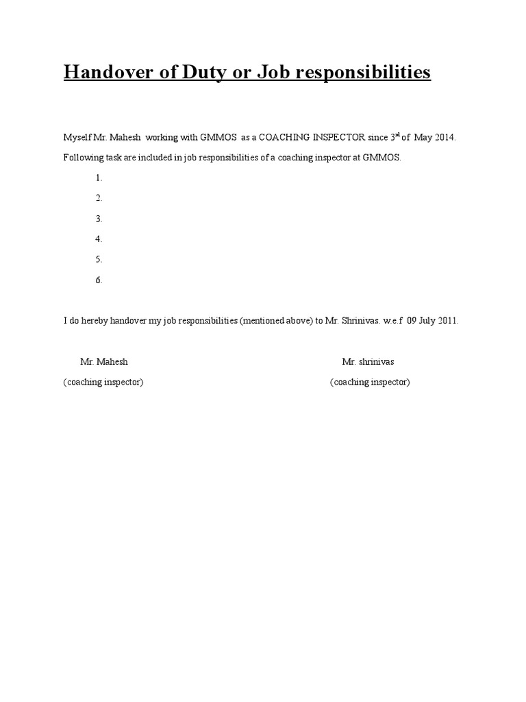 Handover Of Duty Or Job Responsibilities