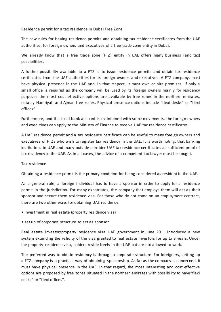 Residence Permit For A Tax Residence In Dubai Free Zone